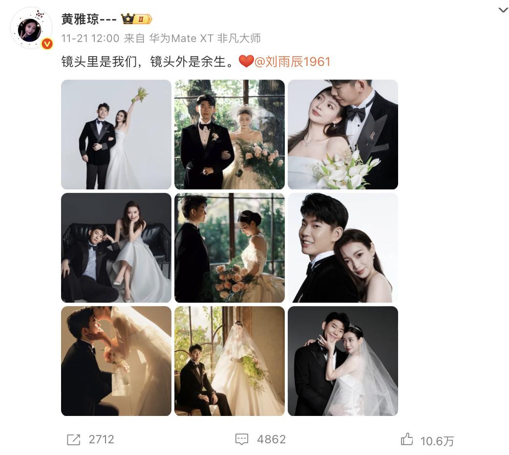 11月21日,黄雅琼在社交平台发布两人婚纱照。