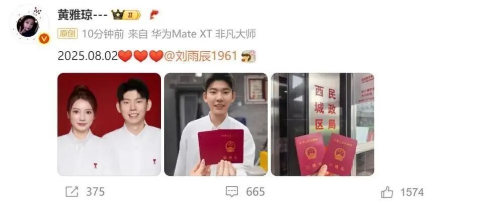 据此前报道,8月2日,羽毛球名将黄雅琼与刘雨辰在13:14晒照官宣领证结婚。