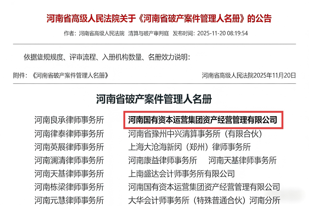 大河网讯 近日,河南省高级人民法院公布最新破产案件管理人名册,河南资本资管公司凭借其专业实力与国企背景,再度成功入选《河南省破产案件管理人名册》胜亿配资 ,成为省级破产案件二级管理人。