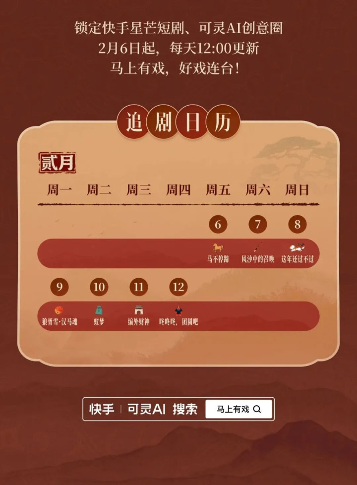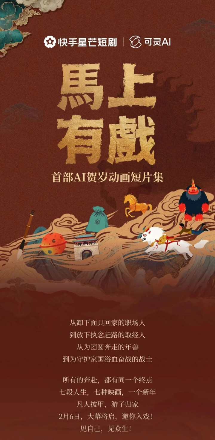 农历新年将至,当无数人怀揣着对团圆的期盼踏上归途,一股由人工智能驱动的创作浪潮,正为我们熟悉的“年味”注入前所未有的光影想象力。近日,快手旗下AI创意生产力平台“可灵AI”正式推出首部AI贺岁动画短片集《马上有戏》,并于2月6日起在快手星芒短剧、可灵AI创意圈平台每日更新。