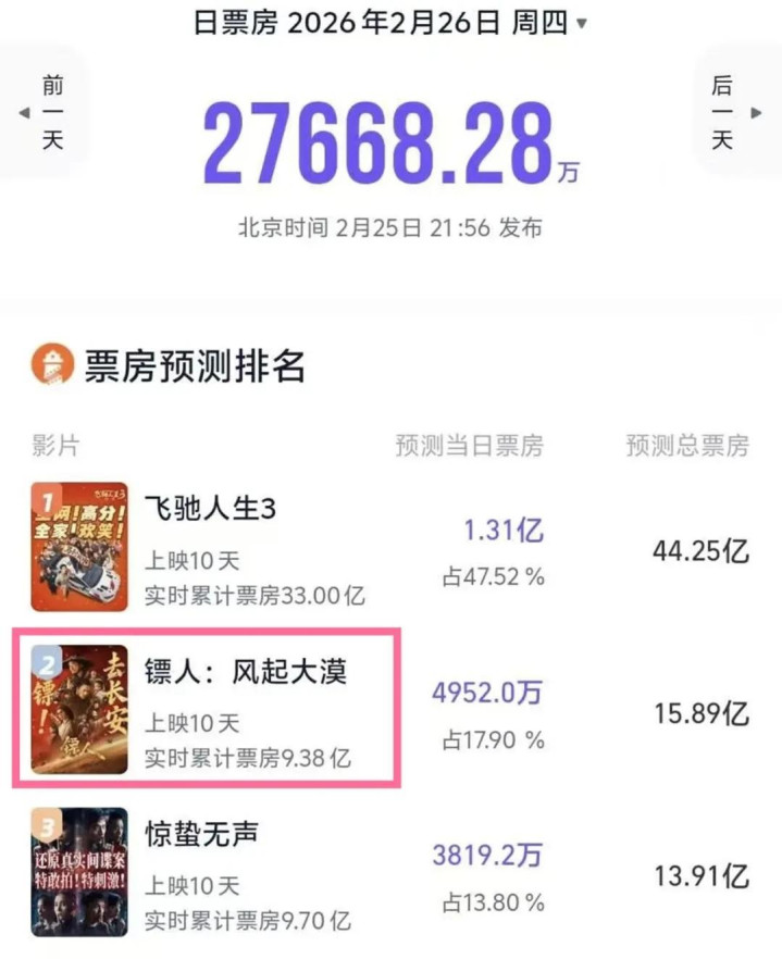 到2月26日,已经拿下中国影史武侠片最高票房纪录的《镖人》,票房破10亿已无悬念。