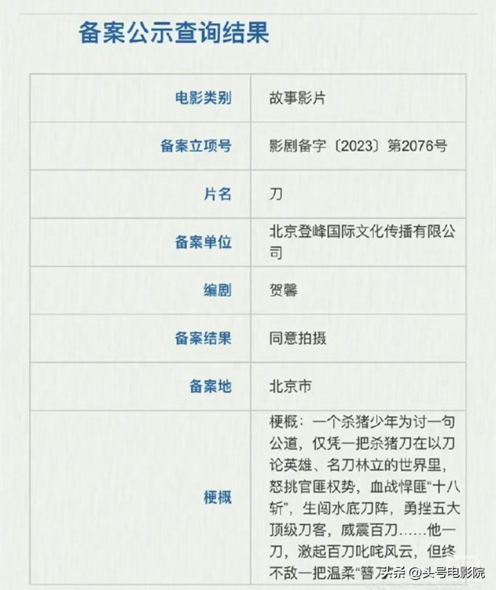 根据国家电影局官网的备案信息,《刀》的故事梗概已经曝光:一个杀猪少年,只为讨一句公道,拎着一把杀猪刀,闯进了一个“以刀论英雄”的世界。